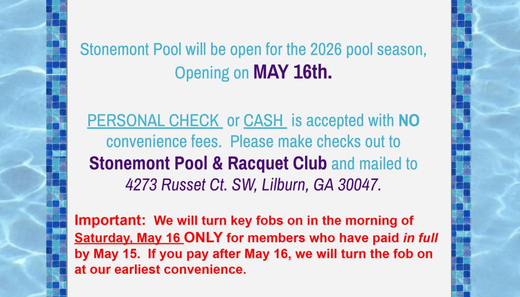 Member ID Cards and Keys (one key for driveway gate, pool gate and bathrooms) will be provided after payment and paperwork is completed and completion of the “Membership and Emergency Information Sheet.”